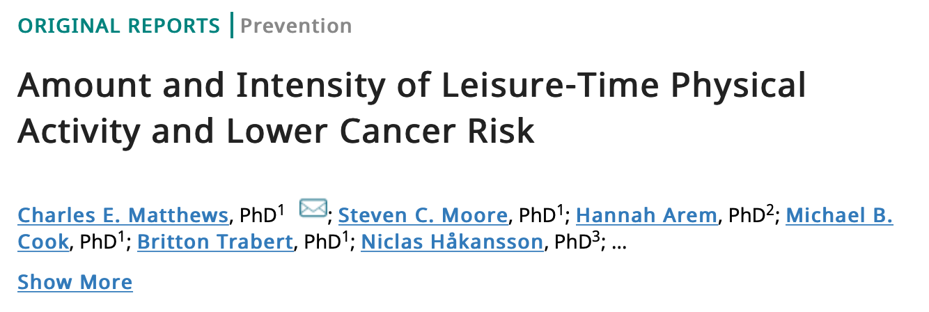 This paper is not about plant-based nutrition, but an important one nonetheless for those practicing lifestyle medicine. Regular physical activity is a crucial lifestyle behaviour for the prevention of cancer, but are the current guidelines sufficient? The 2018 Physical Activity Guidelines for Americans recommend adults should do at least 150 minutes (2 hours and 30 minutes) to 300 minutes (5 hours) a week of moderate-intensity, or 75 minutes (1 hour and 15 minutes) to 150 minutes (2 hours and 30 minutes) a week of vigorous-intensity aerobic physical activity, or an equivalent combination of moderate- and vigorous-intensity aerobic activity. Preferably, aerobic activity should be spread throughout the week. Additional health benefits are gained by engaging in physical activity beyond the equivalent of 300 minutes (5 hours) of moderate-intensity physical activity a week. In this study, data from 9 prospective cohort studies from the U.S., Europe and Australia, including 755,459 individuals, were examined. Engagement in recommended amounts of leisure-time physical activity was associated with significantly lower risk for 7 of the 15 cancer studied, including colon (8%-14% lower risk in men), breast (6%-10% lower risk), endometrial (10%-18% lower risk), kidney (11%-17% lower risk), myeloma (14%-19% lower risk), liver (18%-27% lower risk), and non-Hodgkin lymphoma (11%-18% lower risk in women). There are many mechanisms by which physical activity prevents cancer. These include the maintenance of a healthy weight, maintaining insulin sensitivity, reducing inflammation and enhancing the activity of the immune system. Physical activity also has the capacity to maintain telomere function and favourably alter gene expression.