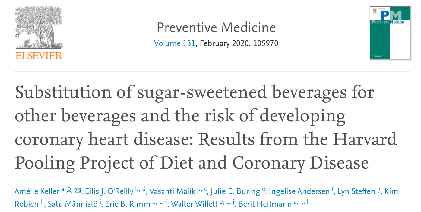 This paper examined data on SSB consumption and the risk of developing coronary heart disease (CHD) from 6 large prospective cohort studies. Amongst the 284,345 individuals included, who were followed for a median of 8.2 years, there were 4248 CHD events and 1630 CHD deaths. In line with previous studies, there was a significant increase in the risk of CHD events — 8% increase for every 335mls consumed on a daily basis. However, the effect on CHD deaths was not statistically significant. The novel aspect of this study was the substitution analysis. Replacing SSB with coffee or artificially-sweetened beverages (ASB) was shown to lower the risk of CHD. Data about water intake, which would be the most sensible drink to replace SSB with, were incomplete or missing in most of the included studies; therefore, substitution of water for SSBs was not assessed.