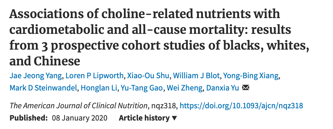 The study highlighted in this post examined the association of choline intake with cardiometabolic and all-cause mortality in 3 prospective studies including 49,858 black, 23,766 whites and 134,001 chinese participants. During a median follow up of 11.7 years, 28,673 deaths were identified, including 11,141 cardiometabolic deaths. The study found that high intakes of total choline and certain choline-containing compounds were associated with increased risk of cardiometabolic mortality, especially diabetes and ischaemic heart disease mortality. Although the mechanism of this assocation was not possible to establish, the authors conclude that it may be beneficial to reduce choline intake by ‘Replacing major food sources of choline (i.e., red meat and eggs) with plant-based foods (e.g., vegetables, nuts, and legumes)’.