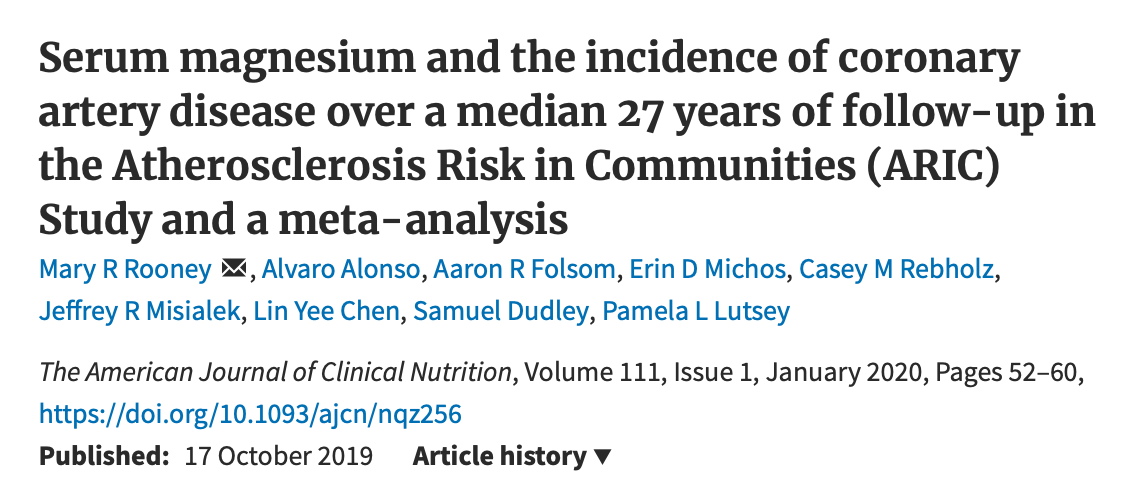 This paper analyses data from the Atherosclerosis Risk in Communities (ARIC) Study, a prospective community-based cohort study which began in 1987–1989, and has >30 y of follow-up. The paper also performs a meta-analysis of 5 studies. The questions asked is whether a low serum magnesium level is an independent risk factor for the developement of coronary artery disease (CAD), as shown in previous studies. Magnesium is a mineral that is essential for basic cellular processes and acts as a cofactor for hundreds of enzymatic reactions. Foods sources of magnesium include green leafy vegetables, whole grains, nuts, legumes, and dairy products. A significant proportion of people eating a typical Western diet fail to meet recommended daily intakes, which in the UK are 300mg/d and 270mg/d for adult men and women, respectively.