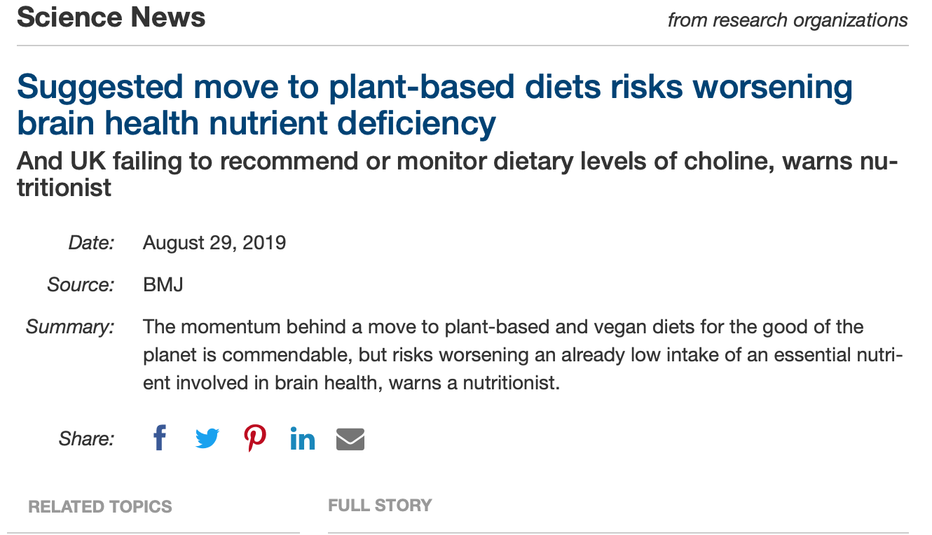 Choline and health outcomes. I am returning briefly to the story that hit the media headlines at the end of August. It suggested that those following plant-based diets are at risk of choline deficiency. This was based on an opinion article by Emma Derbyshire, member of the meat advisory panel, written in BMJ nutrition (note that after publication she added her meat industry affiliation when we and others wrote to the BMJ in protest). High levels of choline are found in meat and eggs but many plant foods also contain choline, mostly at lower levels. But what do we actually know about choline consumption and health. The data at present is quite mixed with studies showing both positive and negative associations with health outcomes. A recent study published online provides population data from the National Health and Nutrition Examination in the US (20,325 participants) plus a systematic review and meta-analysis of prospective data on choline consumption and mortality (149,491 participants). The data show that higher consumption of choline was associated with a higher risk of all cause, cardiovascular and stroke mortality. Higher consumption also resulted in a worse lipid profile and glucose regulation and increased the risk of type 2 diabetes. Why might this be? Choline from meat sources is converted in the gut to TMA and then in the liver to TMAO, which is implicated in the pathogenesis of atherosclerosis, heart failure, type 2 diabetes and renal failure. High choline can reduce levels of homocysteine, another risk factor for cardiovascular disease. The associated worse lipid profile could also be contributory. So, there is no actual evidence that high consumption of choline from meat and eggs is beneficial and the opposite may be true.