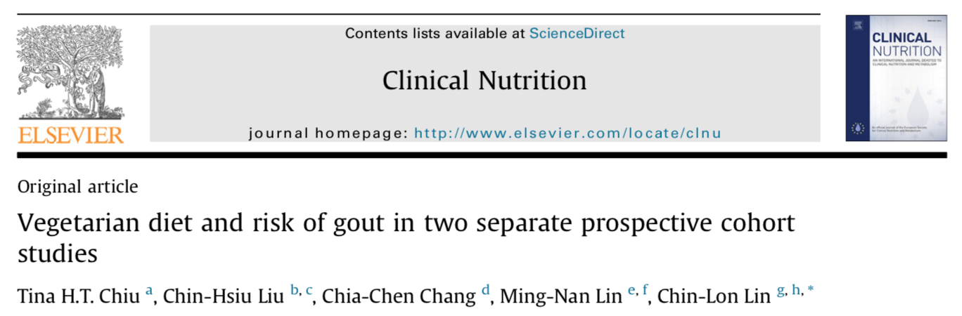 This study examined the association between a vegetarian diet and the risk of developing gout. Data were derived from two prospective cohorts studies from the Tzu Chi population. Tzu Chi volunteers are ‘devoted Buddhists who participate regularly in community charity work, local and international disaster relief, recycling and environmental projects, hospital volunteer work, and fundraising organized by the Buddhist Tzu Chi Foundation. All volunteers went through at least two years of training and had to quit smoking and alcohol drinking before becoming certified as Tzu Chi volunteers. These volunteers are encouraged to consume a vegetarian diet in order to protect animals and the environment’. About one-third of the volunteers were full-time vegetarians (either lacto-ovo vegetarians or vegans).