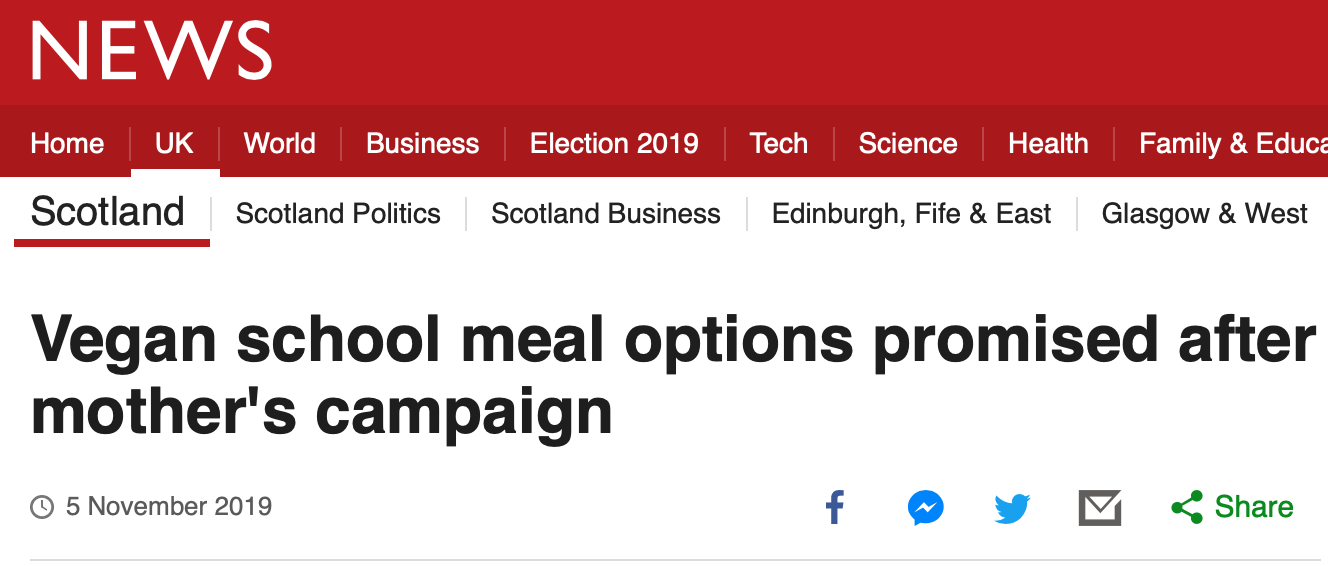 A COUNCIL IN SCOTLAND NOW PROVIDES VEGAN MEALS IN ALL ITS SCHOOLS: This is thanks to a challenge by a mother in Glasgow, supported by the Vegan Society. West Dunbartonshire Council now offer vegan meals in all its schools. Veganism is rising for reasons related to human and planetary health and animal justice. The Economist suggested that 2019 was the ‘Year of the Vegan’. Therefore, it is necessary for public sector institutions to provide vegan meals for students, staff and employees.