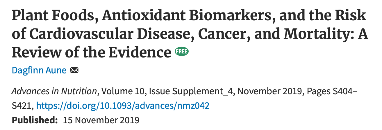 WHAT IS THE OPTIMAL CONSUMPTION OF PLANT FOODS FOR DISEASE PREVENTION?: This paper reviews the available evidence supporting the consumption of various whole plant foods for prevention of cardiovascular disease and cancer and reducing overall mortality. The review found that the consumption of fruits, vegetables, whole grains, and nuts significantly reduced the risk of coronary artery disease, stroke, cardiovascular disease overall, total cancer, and all-cause mortality. The greatest reduction in disease risk was observed when fruits and vegetables were consumed at 800grams/day, whole grains at 225 g/d and nuts at 15–20 g/d. Whole-grain and nut consumption was also associated with reduced mortality from respiratory disease, infections, and type 2 diabetes. Blood concentrations of various antioxidants obtained from whole plant foods, including vitamin C, carotenoids, vitamin E, were strongly associated with reductions in cardiovascular disease, cancer, and all-cause mortality. Of note, one serving of fruits, vegetables, whole grain or legumes is about 80g. The author concludes ‘The current results strongly support dietary recommendations to increase fruit and vegetable intake, but suggest further benefits beyond the currently recommended 5-a-day up to an intake of 800 g/d, particularly for coronary artery disease and for mortality from stroke. The current results also support recommendations to increase whole-grain intake to 225 g/d and nut intake to 15–20 g/d. Diets high in plant foods could potentially prevent several million premature deaths each year if adopted globally’.