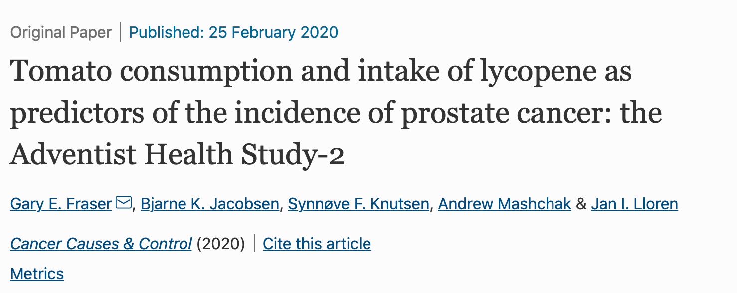 The study highlighed reports data from the Adventist Health Study-2, including 27934 participants and 1226 cases of PC. The results suggest higher intake — 5 or more times/week vs. rarely/never — of canned/cooked tomatoes (but not raw tomatoes) was associated with a 28% reduction in the risk of PC. The consumption of approximately 64g of tomatoes per day was associated with a 14% reduction in risk of PC. I have summarised the data on diet and prostate cancer in this additional article.