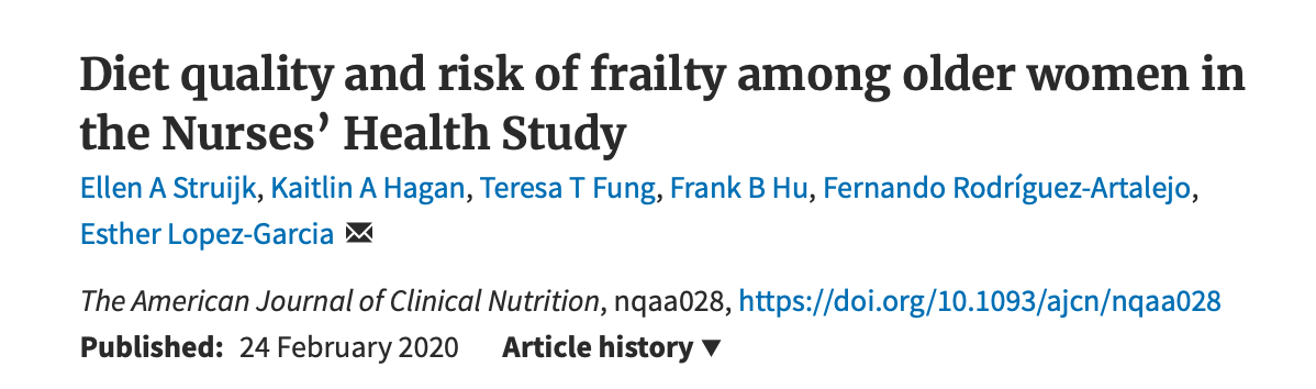 DIET QUALITY AND FRAILTY: Frailty is an increasing problem as the global population live longer. There is no magic pill but there are a number of modifiable and preventable factors, including diet. This study uses data from the Nurses’ Health Study to determine dietary factors that predict for an increased risk of fraility in older women. 71,941 women aged ≥60 years were included. Fraility was assessed using the validated FRAIL scale, which includes 5 self-reported frailty criteria: fatigue, reduced resistance, reduced aerobic capacity, having several illnesses, and a significant weight loss during the previous year. Diet was classified based on adherence to 3 healthy diet quality scores, alternate Mediterranean diet (aMED), DASH, and AHEI-2010. During more than 22 years of follow-up there were 11,564 cases of frailty. Adherence to all 3 healthy diet patterns resulted in a significant reduction in the risk of frailty in the order of 18–25% with incremental benefits with greater adherance. A 1 standard deviation increase in adherence to any of the healthy diet quality scores was associated with a 7–13% reduced risk of frailty. The common factors that appear to be beneficial in these diet patterns are lower consumption of red and processed meat, lower sodium intake, higher ratio of monounsaturated to saturated fat, vegetables, and possibly moderate alcohol intake. So, healthy diets throughout life can help prevent frailty in older age and thus improve quality of life.