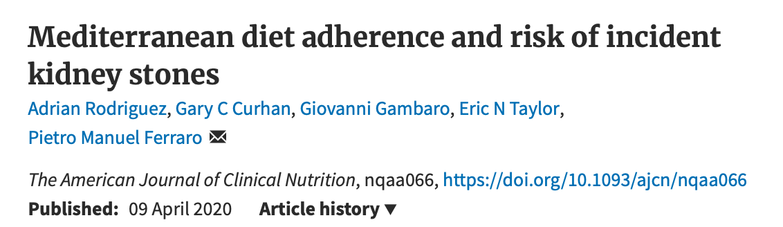 DIET AND KIDNEY STONES: This is a timely study given the recent controversial headlines about Liam Hemsworth suggesting his vegan diet was responsible, in part, for the development of kidney stones. The study includes 193, 527 participants from the Nurses’ Health Study and Health Professionals Follow-up Study and documents 6576 cases of kidney stones. Diet is analysed using the alternate Mediterranean diet score (aMED), which has 9 components; alcohol consumption, whole grains, fruits, vegetables, ratio of monounsaturated fat to saturated fat, red/processed meat, fish nuts and legumes. Red and processed meat consumption is given negative markers whereas the other components are given favorable marks and thus higher scores are associated with consumption of more plant-based foods, fish and moderate intakes of alcohol (5–15g/d). Overall, the results show that a higher adherence to the aMED is associated with a 28% reduction in risk of kidney stones. However, in the breakdown of these results there are some inconsistent findings. A higher consumption of whole grains and fruit, and moderate alcohol consumption, were associated with a lower risk of kidney stone formation in the 3 cohorts. A higher consumption of legumes and nuts was associated with a lower risk of kidney stones only in men, whereas a higher consumption of meat was associated with a lower risk of kidney stones in women but not in men. Higher consumption of vegetables in men was associated with an increased risk. It is difficult to explain some of these associations as they are not consistent with previous data and could be a chance finding. In general most prior studies have shown increased risk of renal stones with increased meat consumption and reduced incidence with more fruit and vegetable consumption.