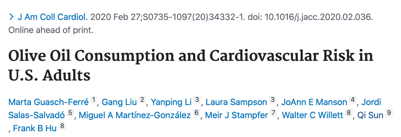 The points worth mentioning from this study include the fact that total olive conusmption that was studied rather than Extra Virgin Olive Oil (EVOO) consumption. Most studies point to benefits of EVOO, the highest quality olive oil, due to higher quantities of polyphenols, including those that are unique to EVOO (oleacein and oleocanthal) and also higher quantities of tocopherols, phytosterols, carotenoids, luteolin, and triterpenic acids. The mean consumption of olive oil in this study was fairly low with only 12 g/day in the highest category (5% of the overall cohort), and only around 10% of participants consumed >1 teaspoon (4.5 g) daily. This is much lower than the usual quantities consumed in Mediterranean countries and also much lower than the quantities used in interventional studies. For example, in the PREDIMED study, the mean olive oil consumption was 38g/d and the intervention arm received 1 litre of EVOO a week. What is not clear is whether olive oil consumption in non-Mediterraena countries is just a marker of a more healthy diet. However, this study does confirm that swapping animal-derived fat, such as butter, margarine, mayonnaise and dairy with olive oil is likely to improve cardiovascular health.