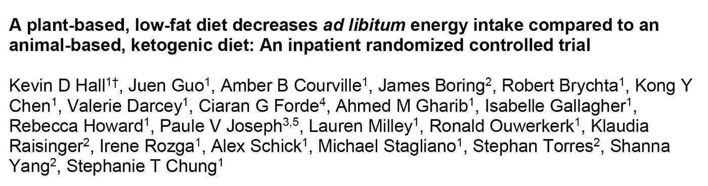 The current study, funded by the NIH, examined a plant-based diet vs an animal-based ketogenic diet and investigated whether ketosis (the generation of ketone bodies) increased fat loss and suppressed appetite. 20 participants, with a median age of 30 years and a median BMI of 28 were admitted to the hospital for 28 days and followed a healthy low fat plant-based diet (75.2% carbohydrate, 10.3% fat) or a low-carb diet (75.8% fat,10.0% carbohydrate) for 2 weeks and then crossed over for 2 weeks on the opposite diet. The participants were offered twice the amount of food they needed on a daily basis and were asked to eat as much as they wanted (ad libitum). The macronutrinent intakes were kept stable in each group with both groups consuming 15% of energy from protein.