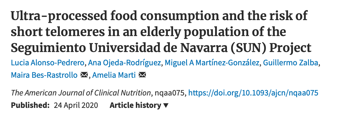 This study from the SUN project examined the impact of ultra-processed food consumption on telomere length in an elderly population. Shortening of the telomeres (caps at the end of chromosomes) is associated with aging and an increased risk of chronic disease. Oxidative stress and inflammation are the mechanisms associated with telomere shortening and can be modified through diet and lifestyle.
