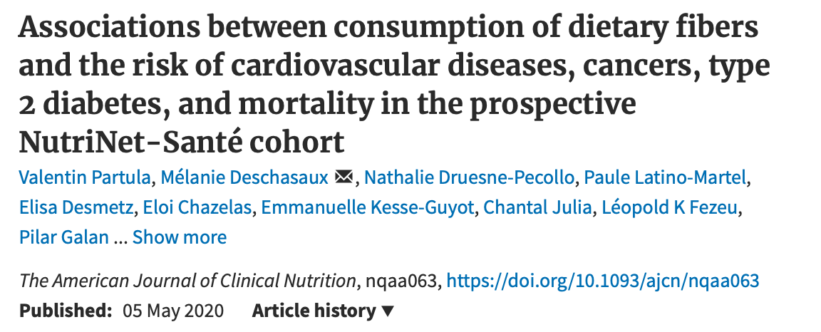This new analysis from the same cohort includes 107377 participants with 635 deaths, 1554 cases of cardiovascular disease and 1711 cases of cancer during a median follow-up of around 5 years. The results showed that a high intake of dietary fibre (30 vs 11 g/d) was associated with a lower risk of cardiovascular disease (14%), ischemic heart disease (9%), cerebrovascular disease (21%), type 2 diabetes (42%), colorectal cancer (32%) and breast cancer (21%), although there was no association for all-cause mortality. When specific types of fibre were examined there was a stronger reduction in risk observed for soluble fibre and cardiovascular disease (20%), ischaemic heart disease (30%), and colorectal cancer (62%). When food sources of fibre were analysed, inverse associations were observed for fibre from whole grains and mortality from all causes, cancer and cardiovascular disease combined. In addition, fruit fibre reduced the risk of cardiovascular disease, type 2 diabetes and colorectal cancer.