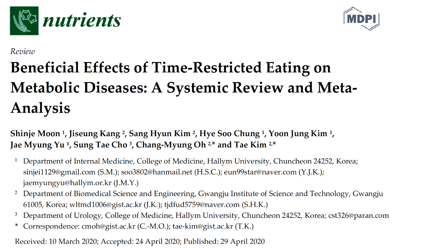 TIME-RESTRICTED EATING (TRE): TRE or intermittent fasting has gained popularity over the last decade. It is an attractive method for weight loss as it does not rely on calorie reduction. Initally there was not a robust body of science to support this way of eating but now the evidence seems quite compelling. This systematic review and meta-analysis of 19 intervention studies, 12 of which were randomised studies, shows a significant benefit for weight loss, decrease in fat mass (without loss of muscle mass), lowering systolic blood pressure and blood triglyceride levels. The effect on LDL and HDL-cholesterol levels was not significant. The studies included used a range of fasting schedules but the most common was fasting for 16 hours and eating within an 8 hour window. The type of schedule did not appear to impact the results.