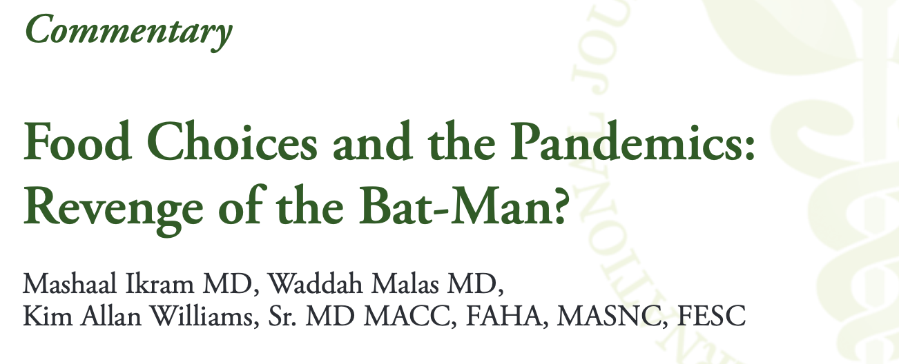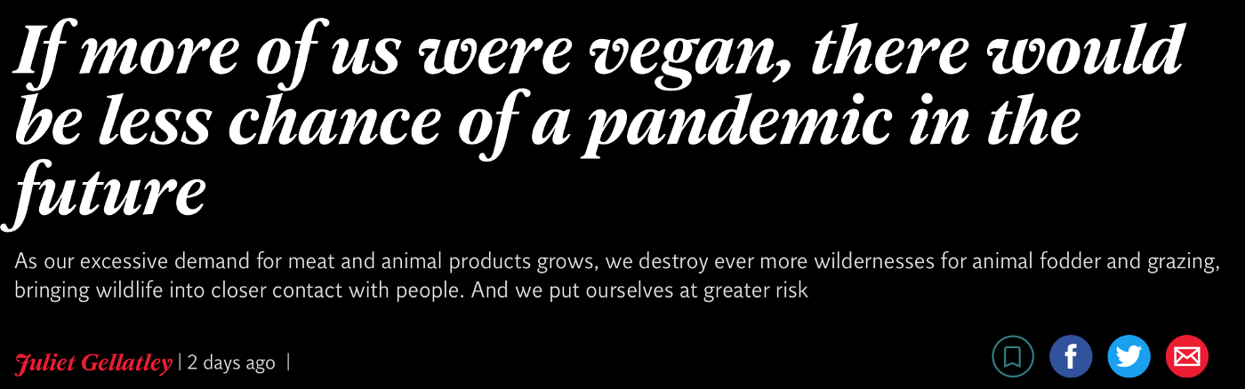 FOOD CHOICES AND PANDEMICS: It is difficult not to keeping coming back to this topic. It is clear to those that delve just a little below the surface that our global food system is not only destroying the planet but is contributing to the generation of new human infections with pandemic potential. The current SARS-CoV-2 pandemic is just one example of many over the last century, highlighted in the video. I am pleased that health professionals and scientists continue to highlight the important link between our desire to eat animals and the crisis we are facing. A couple of good articles from this week are highlighted below.