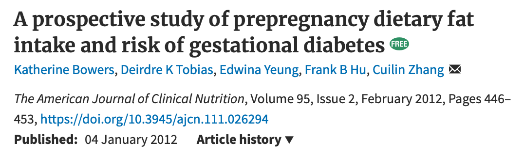 This study included 13,475 women who reported a singleton pregnancy between 1991 and 2001 in the Nurses’ Health Study II. There were 860 cases of type 2 diabetes in the 10 years of follow-up. The purpose of the study was to investigate the impact of prepregnancy dietary fat consumption on the risk of gestational diabetes, and whether the type and source of fat (animal vs vegetables) had a impact. The results showed that higher intakes of both animal fat and cholesterol prior to pregnancy significantly increased the risk of gestational diabetes in the order of 45–90% for those consuming the highest amount compared to those eating the lowest. Sustitution analysis showed that replacing animal fat with vegetables fat reduced this risk. This remained a significant finding after adjusting for other dietary and non-dietary risk factors.