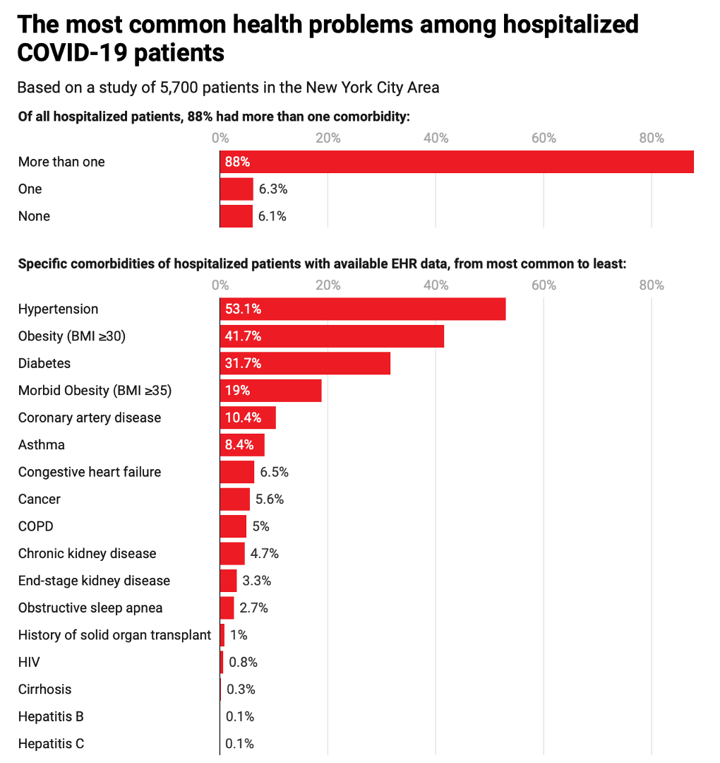 The image below summarises data from 5700 cases of COVID-19 (the disease caused by the virus) in New York.