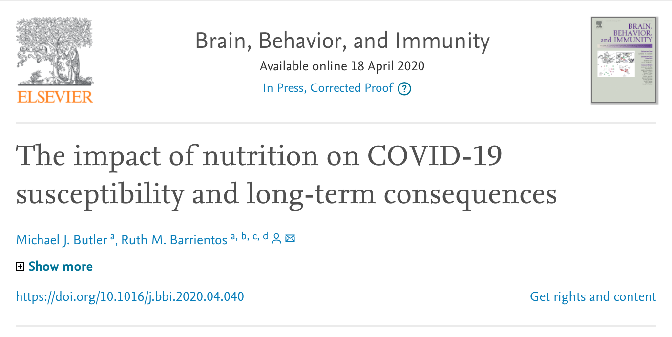 The majority of these chronic diseases could have been prevented by addressing diet and lifestyle factors. The paper below summarises these observations. It reminds us that the Western diet pattern high in saturated fats, sugars, and refined carbohydrates promotes inflammation and oxidative stress and impairs the immune response to viruses. The authors also hypothesize that inflammation caused by COVID-19 may have long-term consequences in those that recover, leading to chronic medical conditions such as dementia and neurodegenerative disease, likely through neuroinflammatory mechanisms that may be compounded by an unhealthy diet. Thus access to healthy foods and making healthy choices now and beyond this pandemic is going to be crucial to surviving the longer term impact.