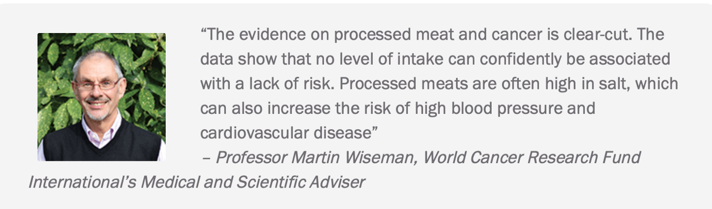 Remember also that in 2015, the WHO classified processed red meat as a group 1 carcinogen (causes cancer) and red meat as a Group 2a carcinogen (probably causes cancer). The World Cancer Research Fund recommends limiting the consumption of red and processed meat.