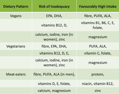 It’s a common albeit overstated concern that plant-based diets, such as the Planetary Health Diet, increase risk of nutrient deficiencies. In 2021, a systematic review of 141 observational and intervention studies aimed to assess the nutritional adequacy of meat-based diets compared to plant-based diets (mainly vegetarian and vegan). All diet patterns had nutritional inadequacies, as shown in Table 1 below. Meat-eaters were at risk of inadequate intakes of fibre, polyunsaturated fatty acids (PUFA), alpha-linolenic acid (ALA), folate, vitamin D, E, calcium and magnesium. Vegetarian and vegans had lower intakes of eicosapentaenoic acid (EPA) and docosahexaenoic acid (DHA), vitamin B12, vitamin D, iron, zinc, iodine, calcium and lower levels of bone turnover markers than meat eaters. Vegans had the lowest vitamin B12, calcium and iodine intake, and also lower iodine status and lower bone mineral density. Fibre, PUFAs, folate, vitamin C, E and magnesium intakes were high in plant-based diets. Average fibre intake amongst vegans was 44g/d compared to 28g/d in vegetarians and 21g/d in meat eaters. All diet groups met protein and energy requirements.